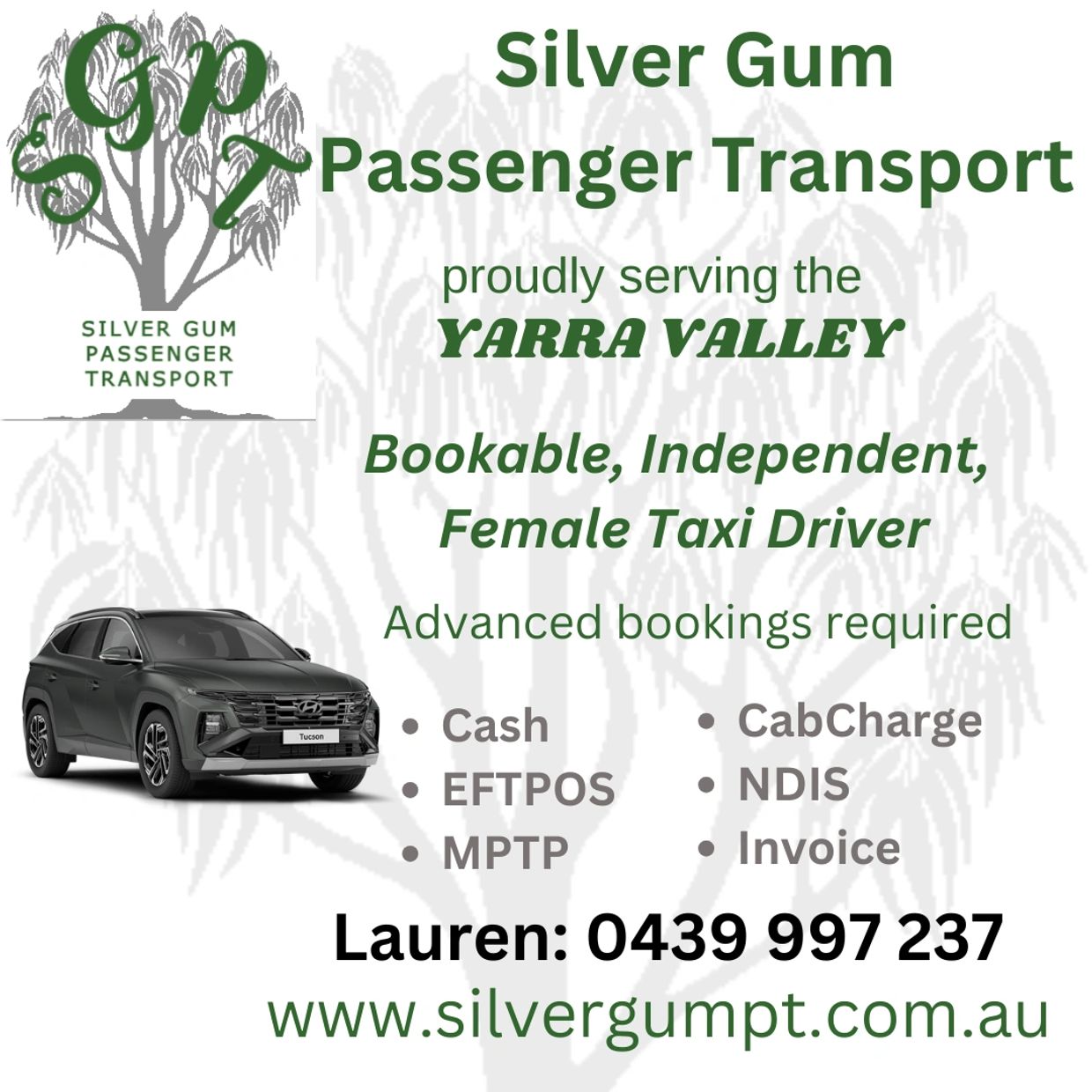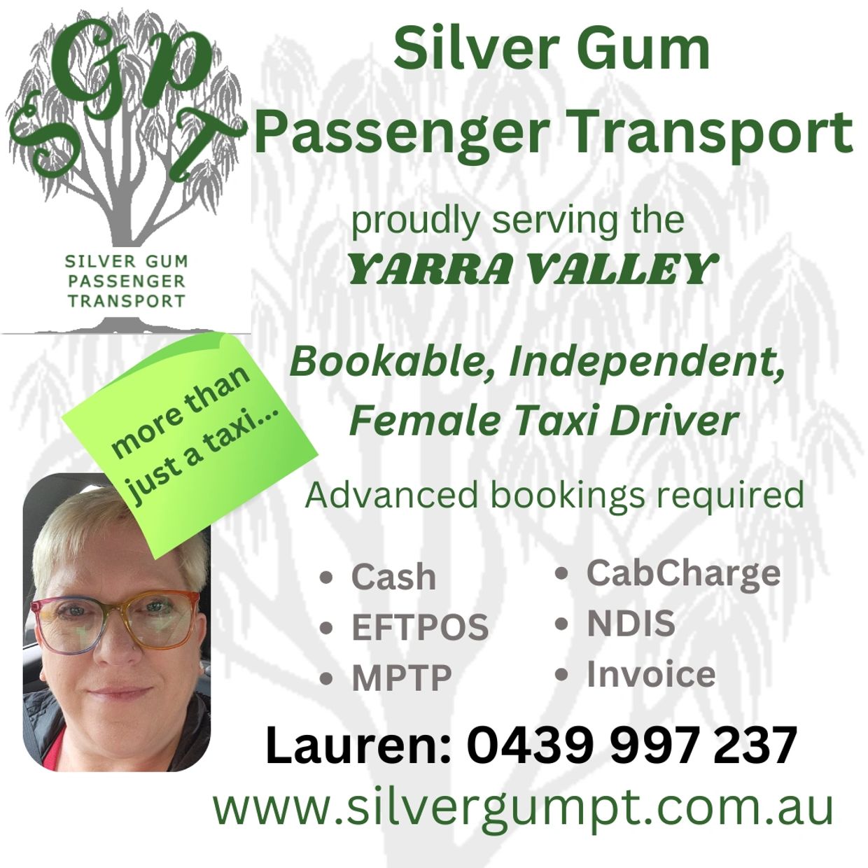 My name is Lauren, and I'm a one-woman show. I aim to provide a lower-cost, reliable and caring service in a field where there is so much competition. I'm also a mum to a neurodivergent early-teen, and carer of my octogenarian mum with vision and mobility disabilities. And it's in these roles that I was motivated to start SGPT. I understand the challenges that families, carers, and individuals face in accessing reliable transport throughout the Yarra Valley.